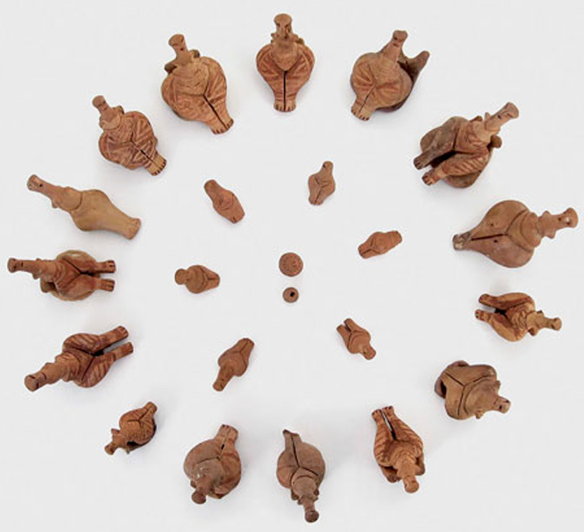 Fired clay figures found in a tomb near the Black Sea in Cernavodă, Romania. Hamangia culture, 5000 BC. National History and Archaeology Museum, Constanța, Romania. Photograph from Wikimedia Commons, public domain image.