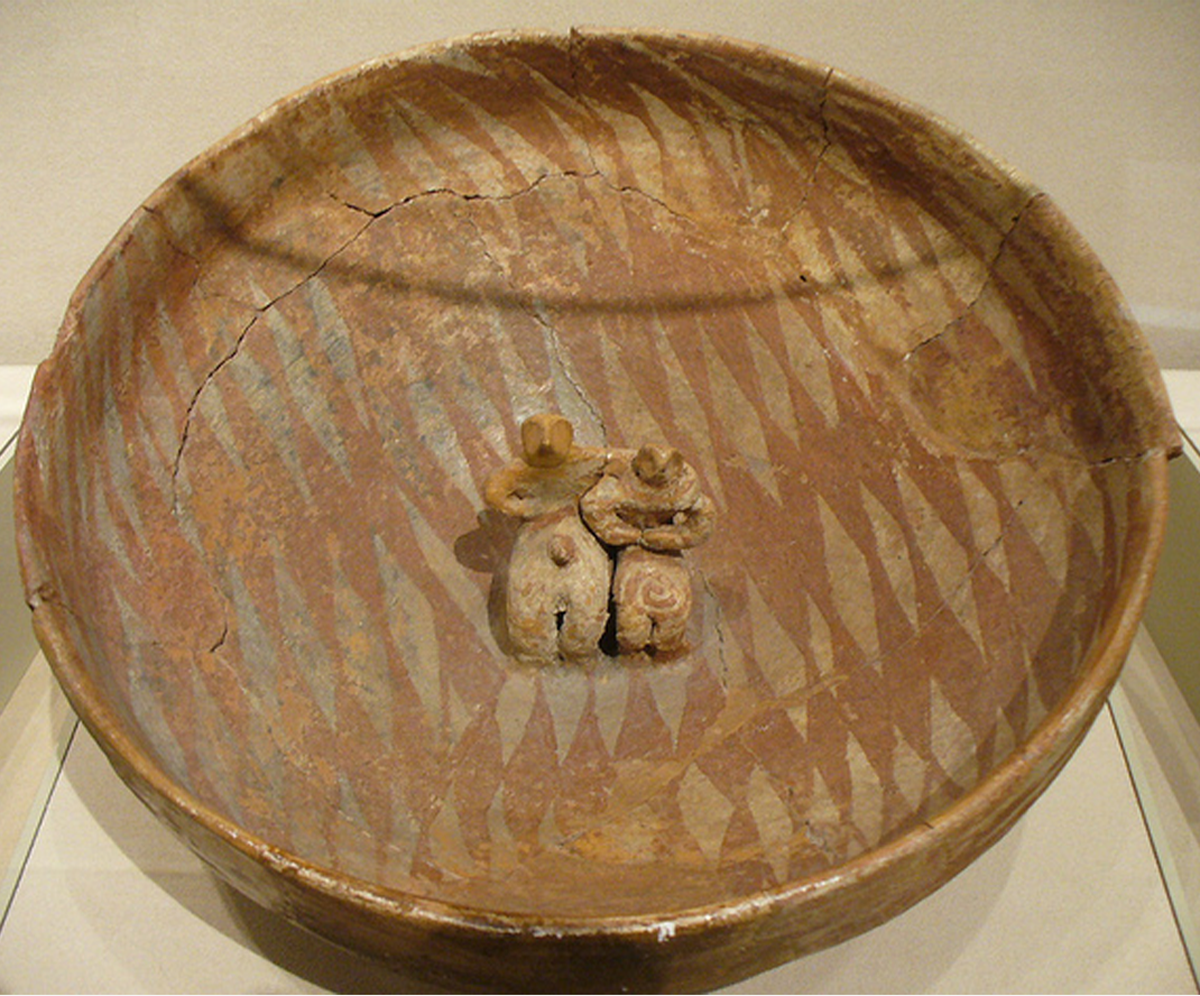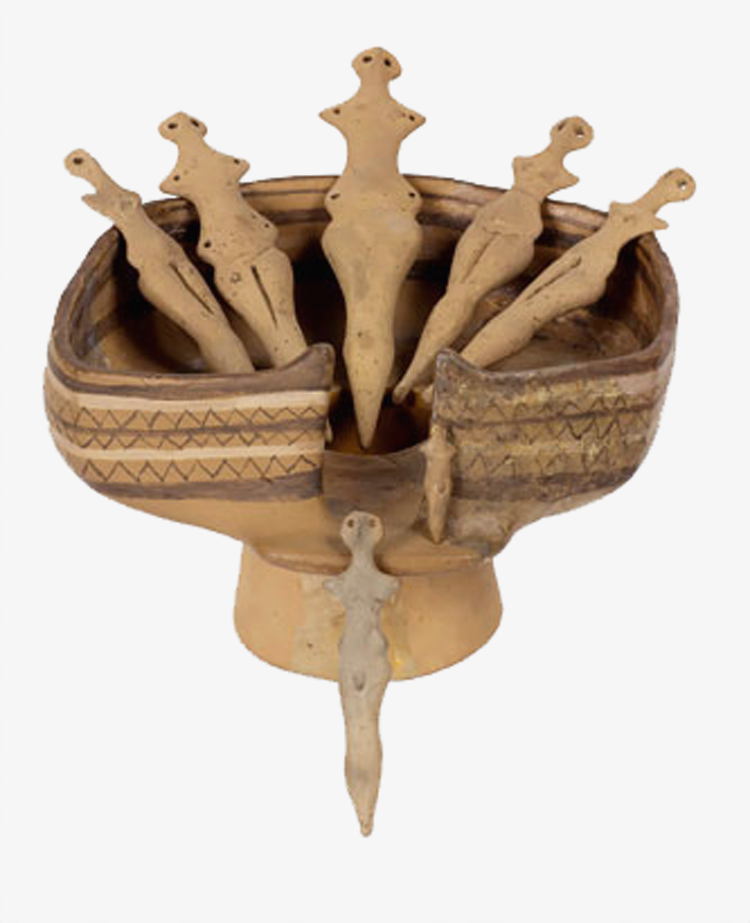 Seven figures with container. Fired clay. Cucuteni culture, Ghelăieşti, 3700 BC. Neamț County Museum Complex, Piatra Neamț, Romania. Photograph © Cristian Chirita, Wikimedia Creative Commons.