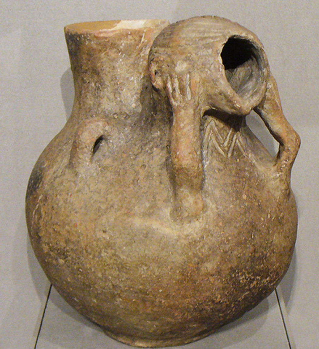 A mourner. Fired clay, Cucuteni-Trypillian, male, circa 4750 BC. Cucuteni Eneolithic Art Museum, Piatra Neamț, Romania. Photograph © Cristian Chirita, Wikimedia Creative Commons.